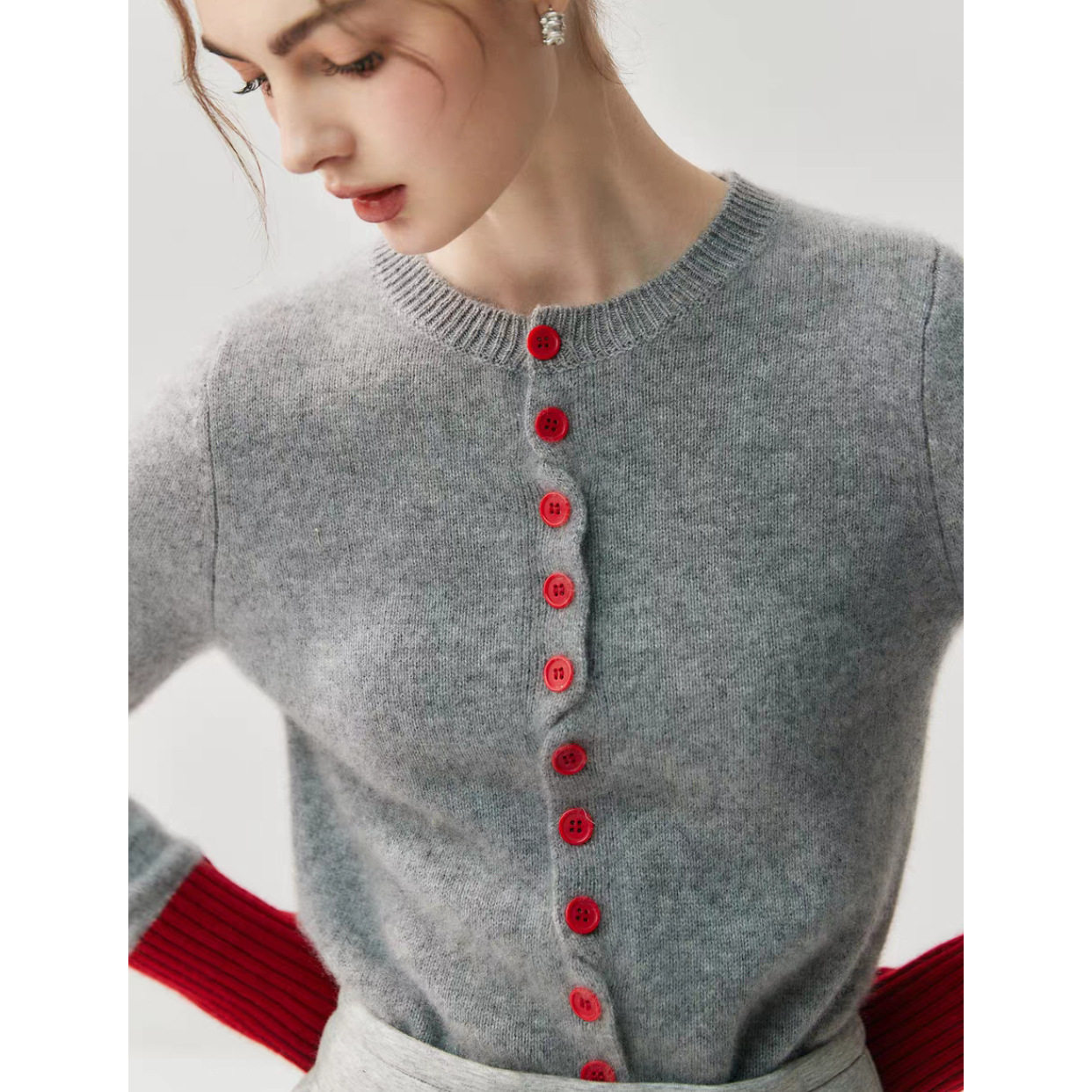 7AM10PM 高级灰色羊毛开衫 百搭圆领毛衣女 100%全羊毛针织外套