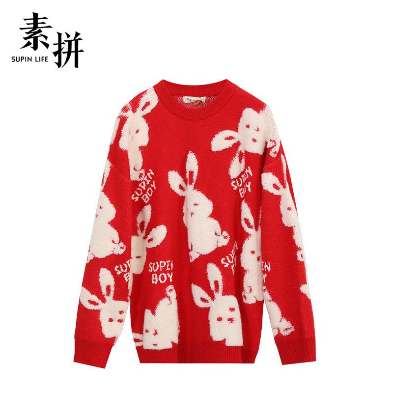 素拼男装秋冬季毛衣宽松圆领红色潮牌针织衫SPAZZ310005AM