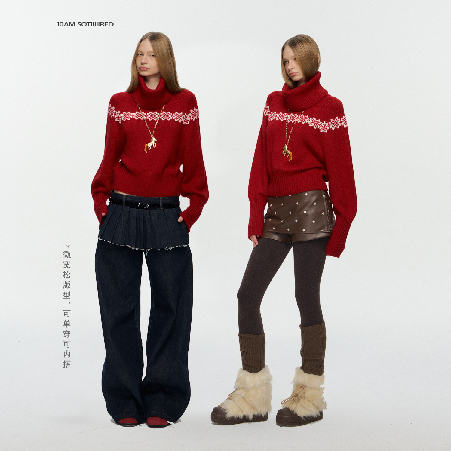 10AM*圣诞新年 费尔岛30%羊毛可拆卸脖套高领宽松提花红色毛衣