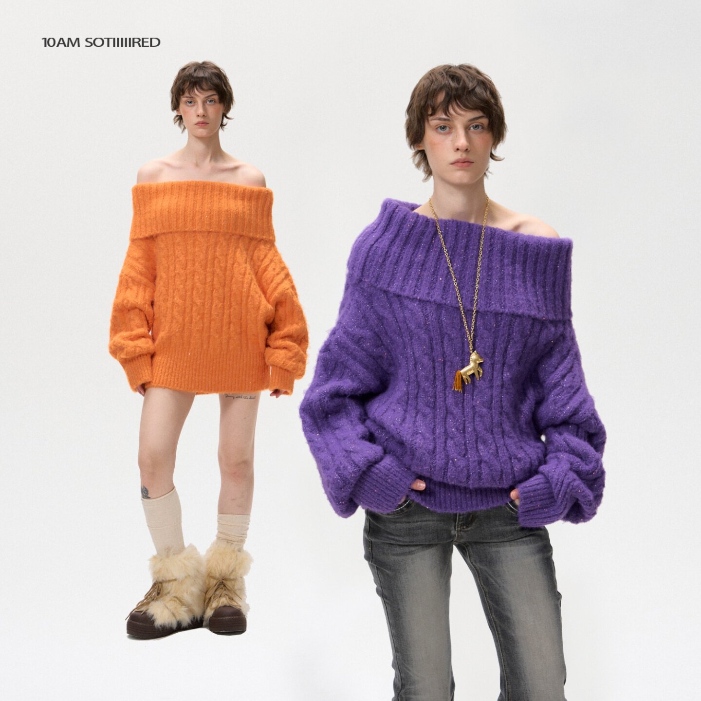 10AM*羊毛混纺慵懒风高级感亮片一字肩绞花套头紫色厚毛衣女冬季