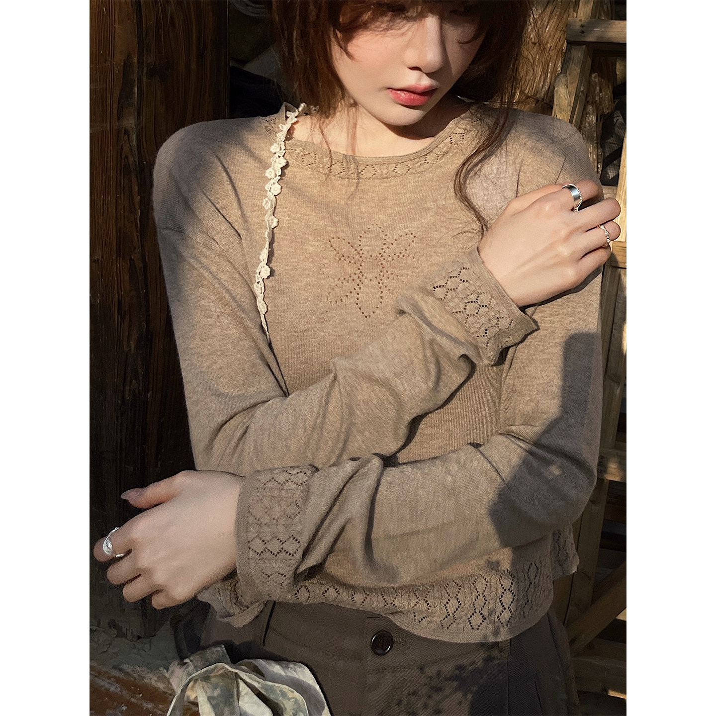 JMWOMEN 26SS 3/4 10:00am 限时折扣 棕色镂空刺绣花卉薄毛衣