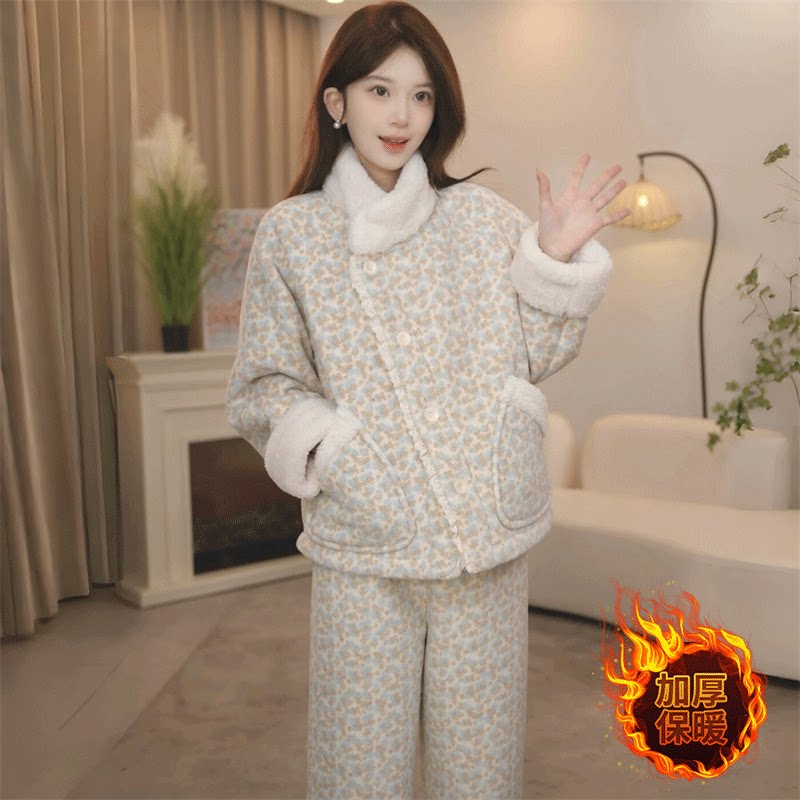 温柔奶油碎花加厚加绒睡衣套装女秋冬款保暖毛绒立领家居服两件套