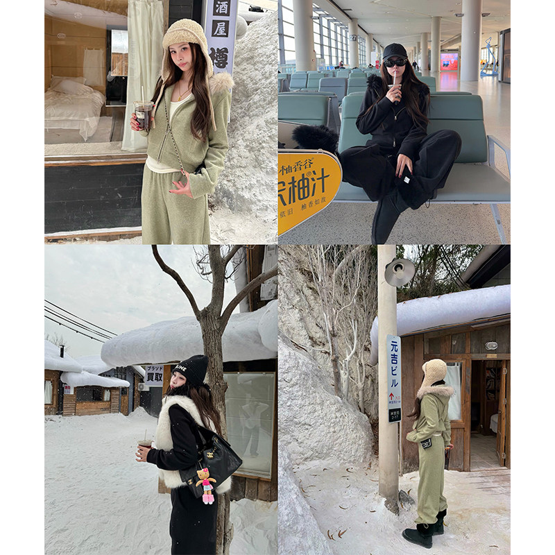 tingtings 黑色毛领卫衣套装女秋冬新款加绒慵懒休闲外套运动长裤