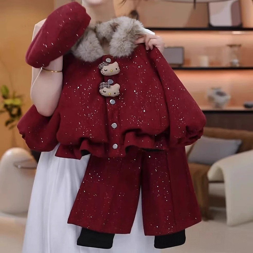 女童套装2025新款秋冬装儿童洋气汉服中式国风加绒加厚女孩三件套