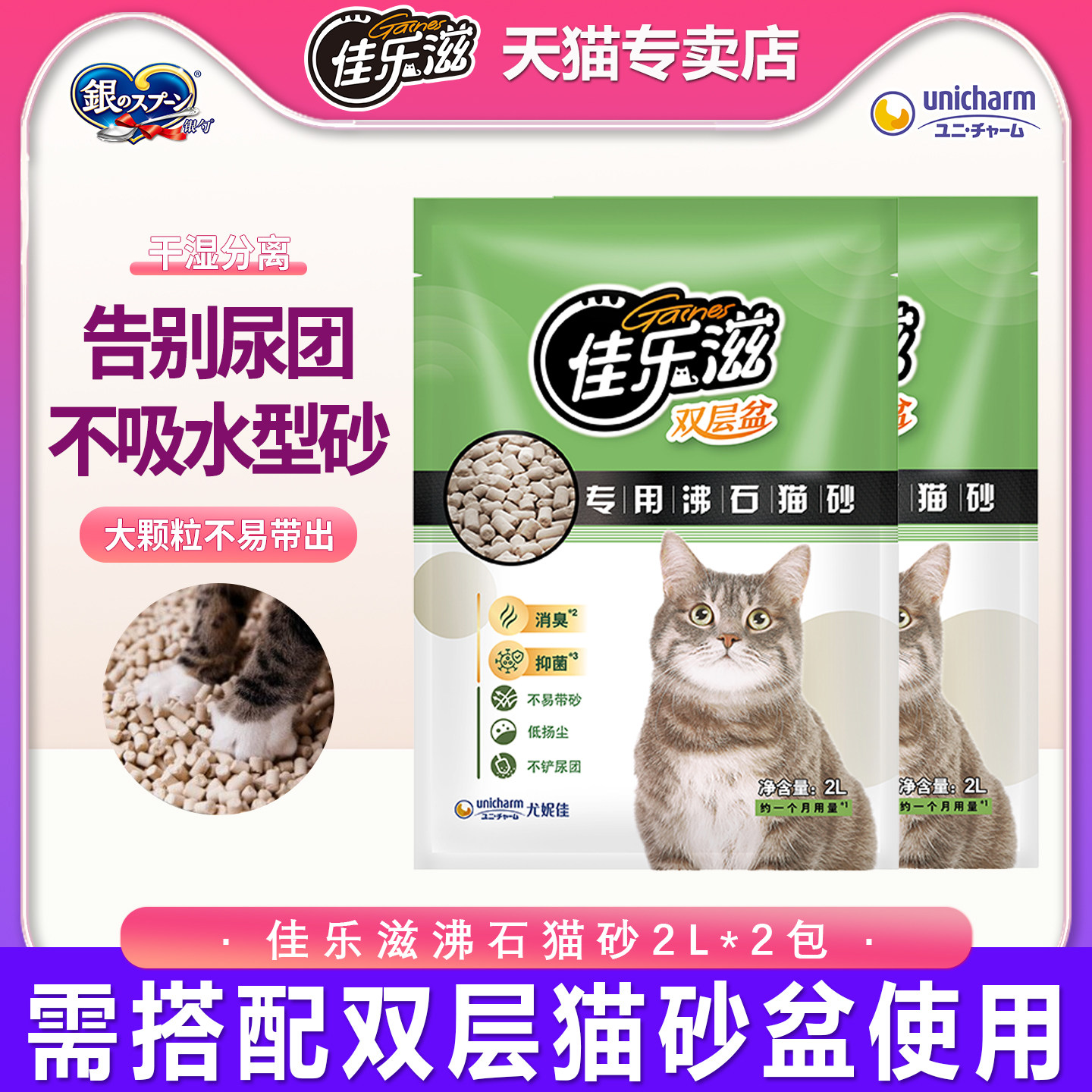 日本进口!佳乐滋沸石猫砂新款小颗粒3.8L双层盆专用低尘除臭环保