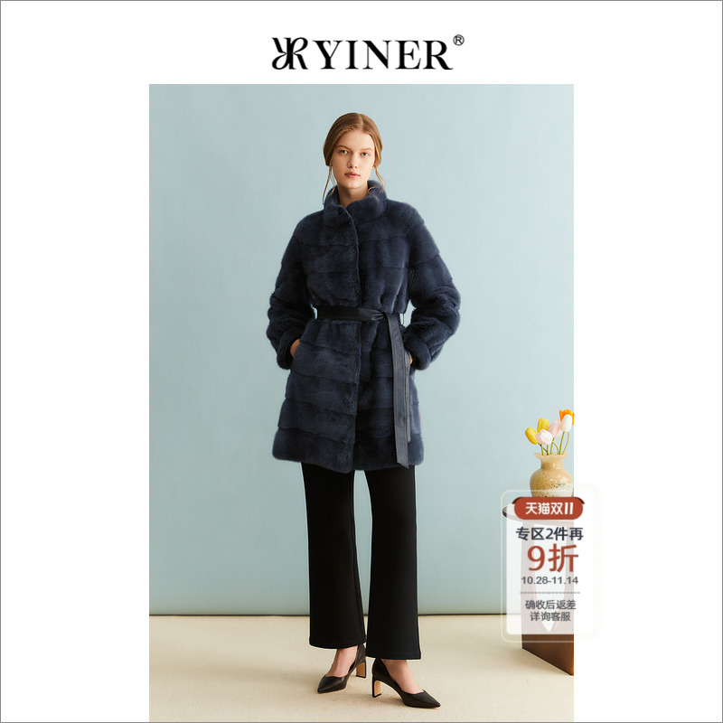 YINER音儿专选女装冬季优雅中长款保暖立领整貂水貂毛皮草外套