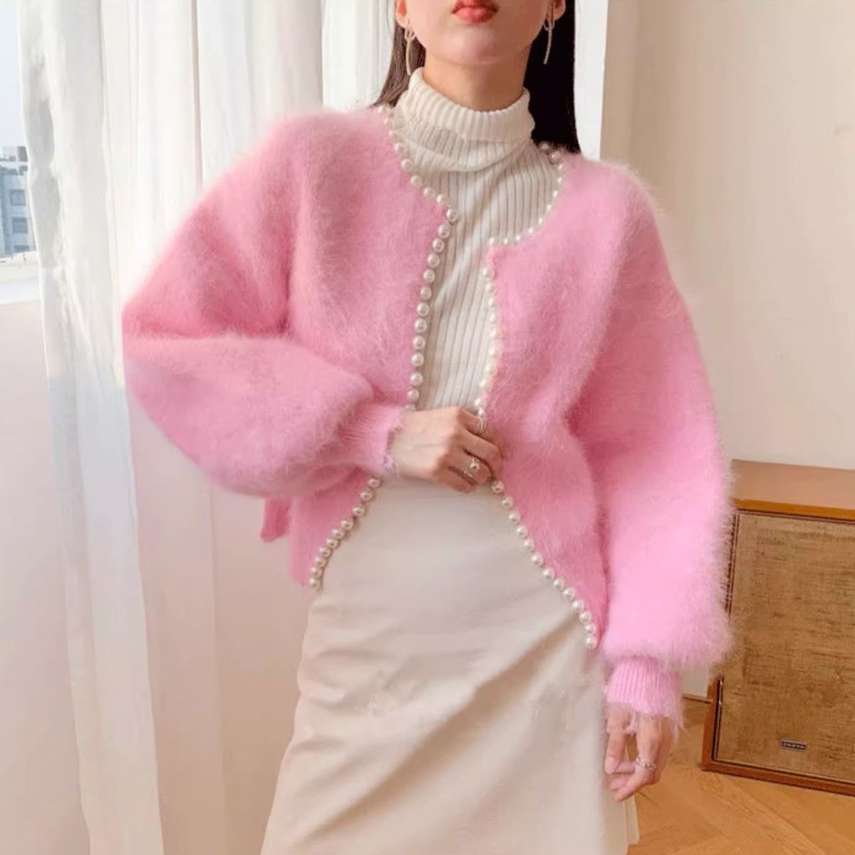 2024秋冬加厚马海毛上衣珍珠灯笼袖小香风貂绒毛衣短款开衫外套女