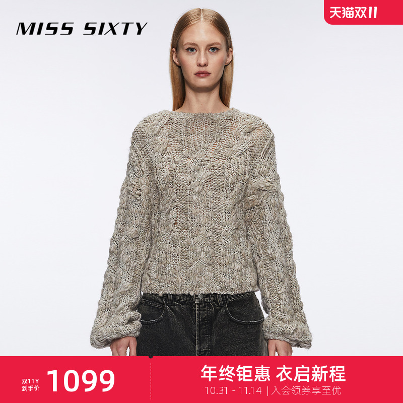 【保暖含羊驼毛】Miss Sixty针织衫女绞花麦穗肌理短款灯笼袖毛衣