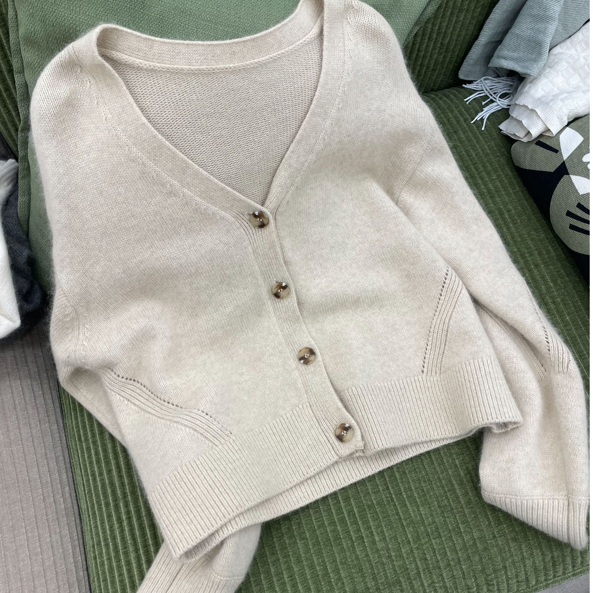 V领羊毛衫毛衣外套女短款开衫宽松慵懒风灯笼袖秋冬针织春秋厚款