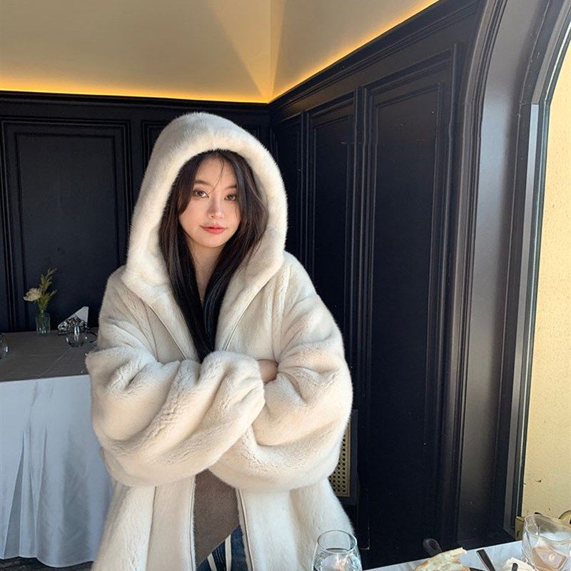 水貂毛貂皮大衣冬季加厚外套女2024新款长袖毛毛连帽年轻款仿皮草