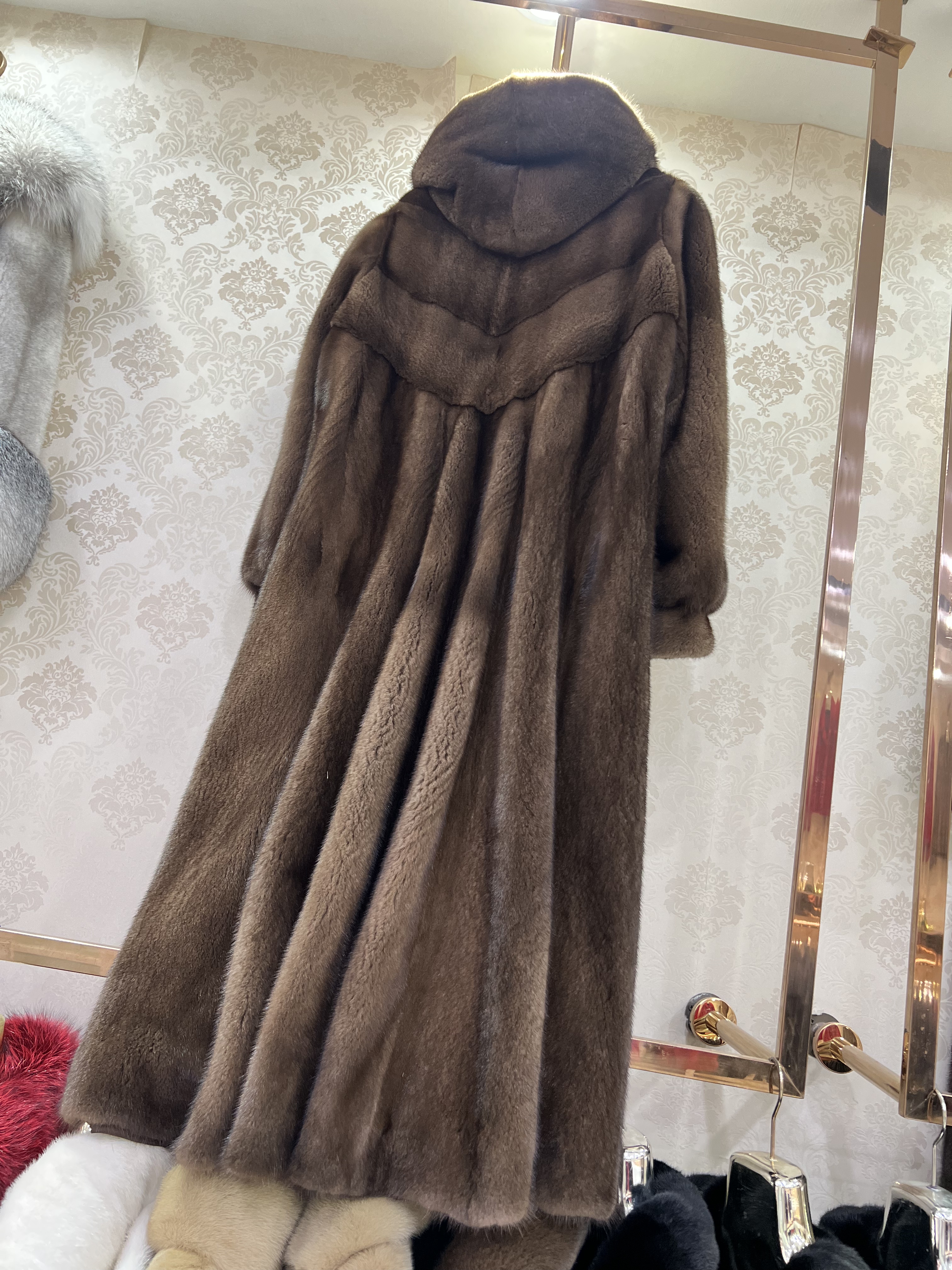 125cm进口貂皮大衣女整貂连帽长款水貂毛皮草外套长袖浪尾款冬季