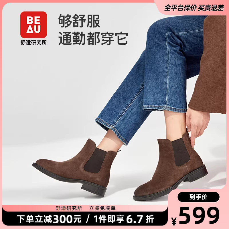 星期六黑色短靴女2025秋冬方头英伦风粗跟切尔西靴真皮侧拉链单靴