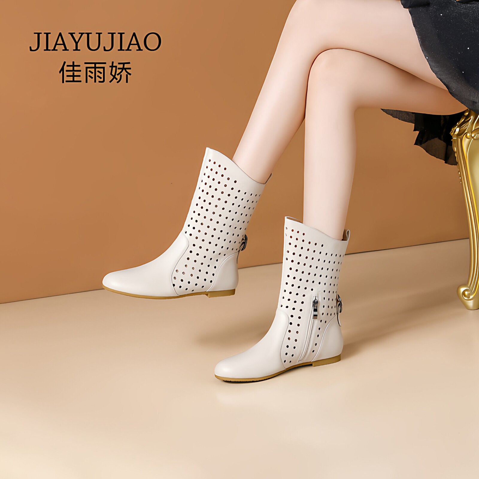 真皮镂空网靴单靴女春秋2026新款女靴白色洞洞短靴凉靴夏季女鞋子
