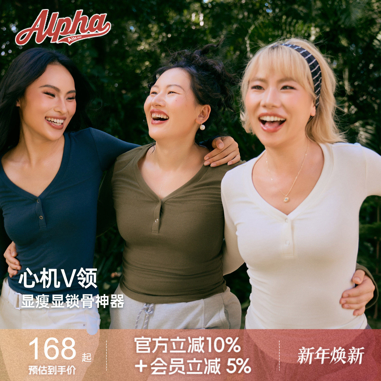 AlphaGym含绵羊毛V领亨利衫女秋冬弹力显瘦喇叭袖针织长袖打底衫