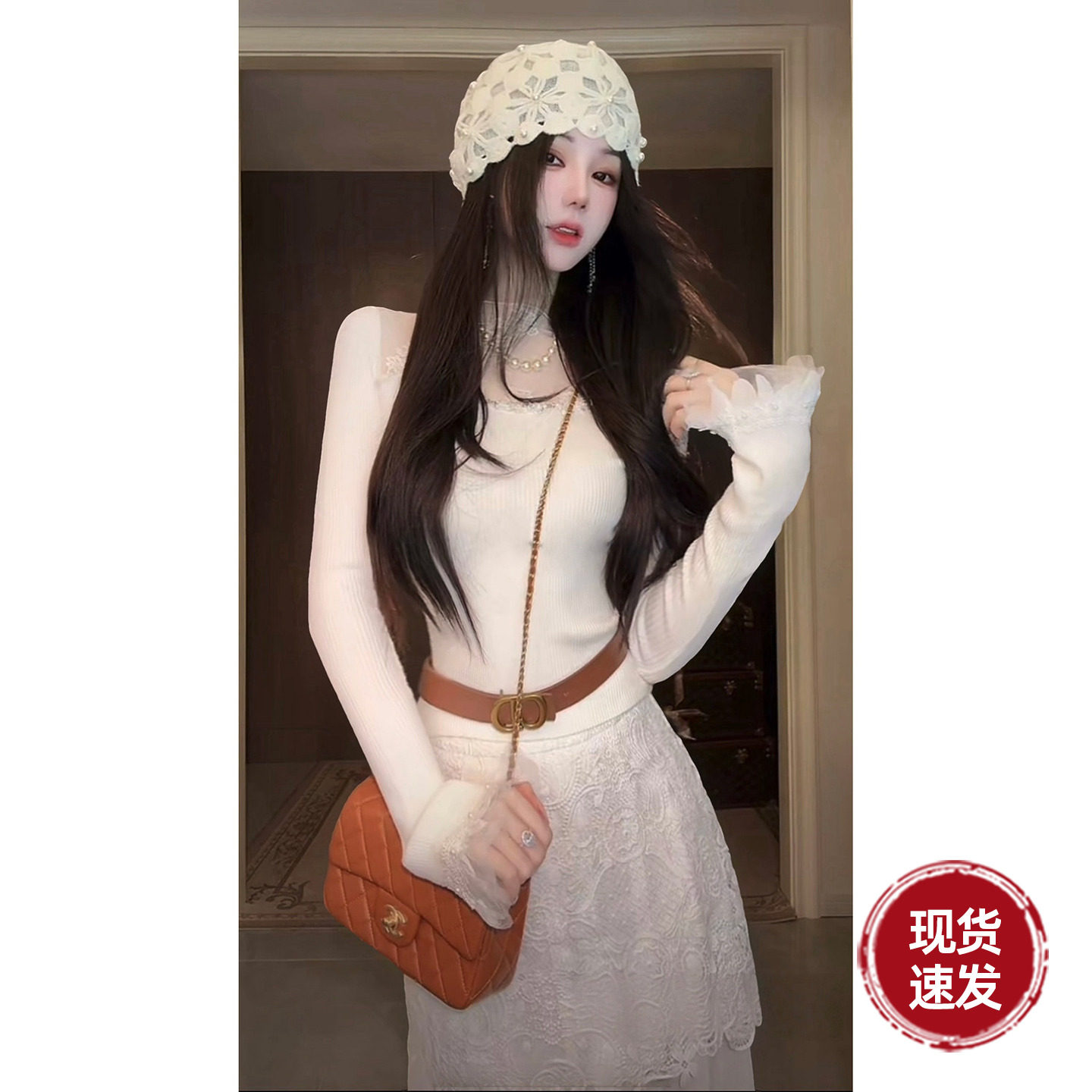 蕾丝衫女2025秋冬新款欧洲站纯色蕾丝钩花喇叭袖打底衫长袖上衣