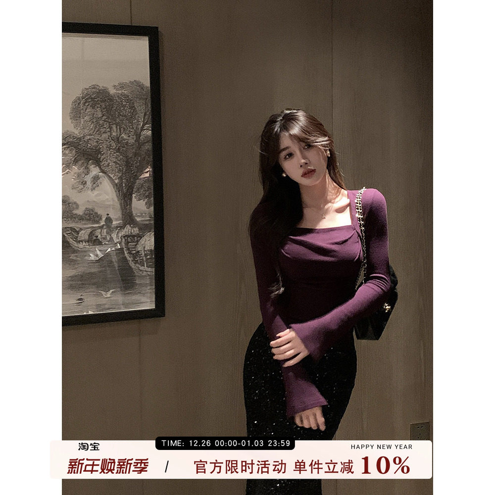 秋冬新款修身长袖打底针织衫上衣洋气设计感小众喇叭袖毛衣女内搭
