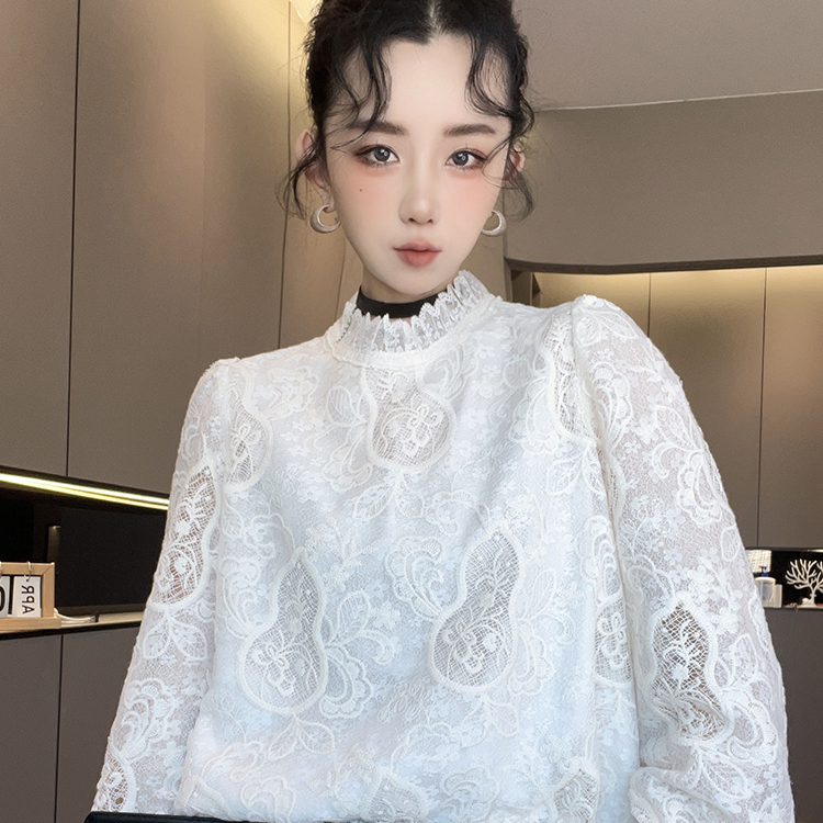 蕾丝衫女2025冬季新款纯色减龄蕾丝钩花立领喇叭袖打底衫长袖上衣