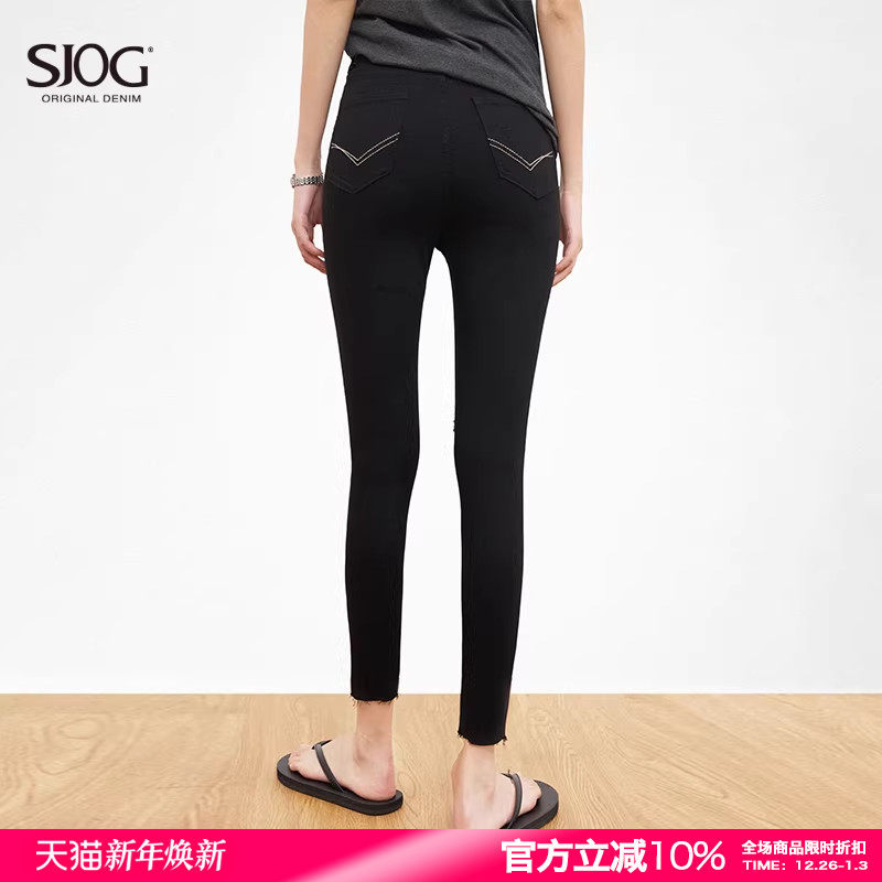 - 黑色破洞小脚九分裤女