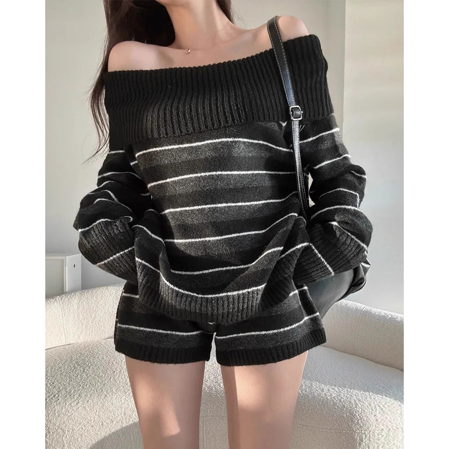 时尚套装小性感一字肩软糯条纹毛衣女2025秋季新款高腰显瘦短裤子