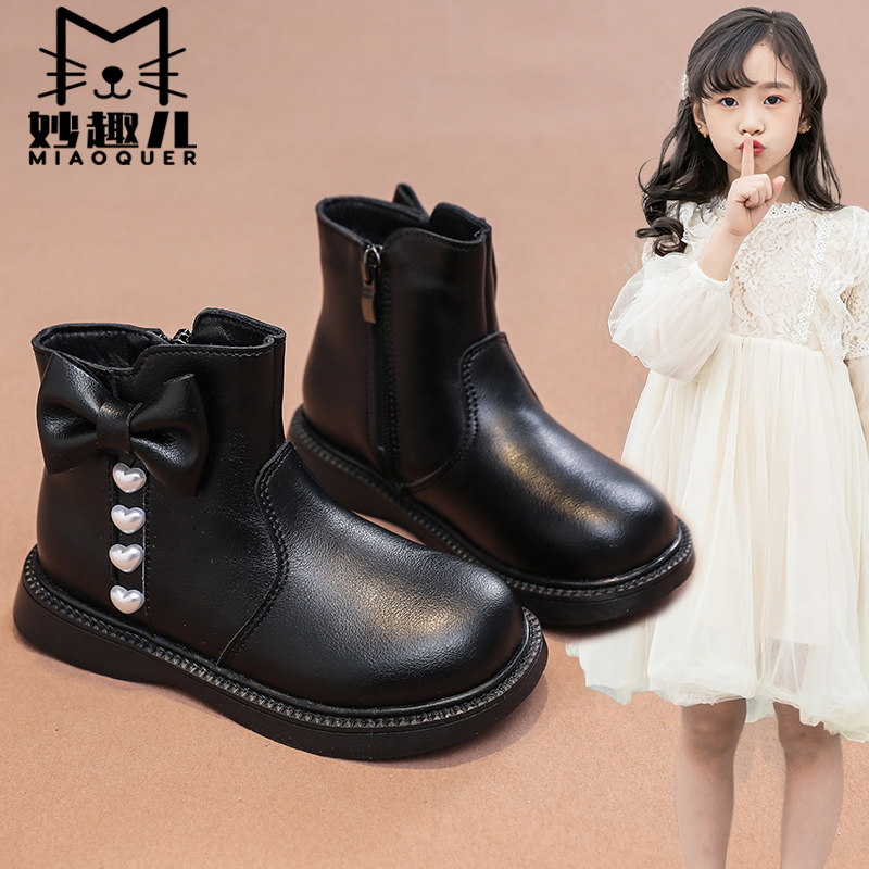 妙趣儿女童短靴黑色加绒公主靴时尚儿童软底秋冬小女孩宝宝单靴子