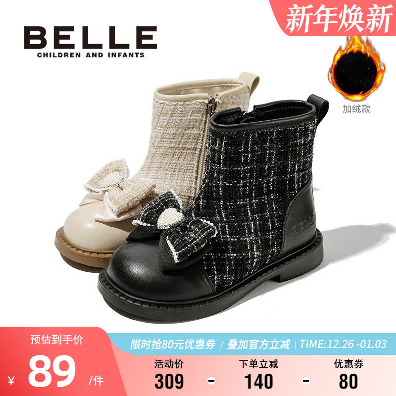 百丽童鞋女童短靴冬季加绒保暖时装靴儿童舒适软底皮靴女孩公主靴