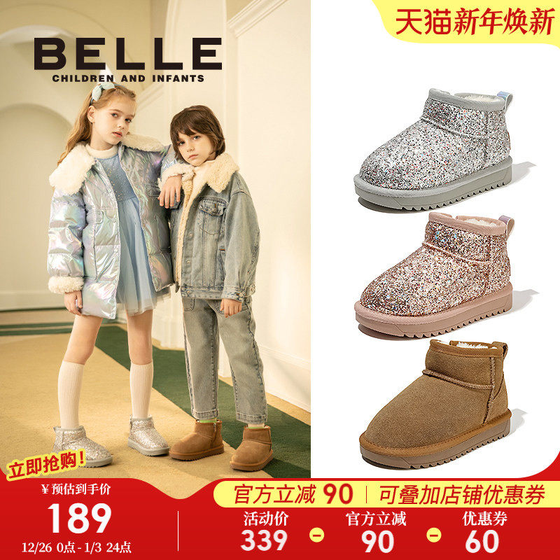 百丽童鞋儿童雪地靴女童短靴冬季新款女孩宝宝加绒保暖户外大棉鞋