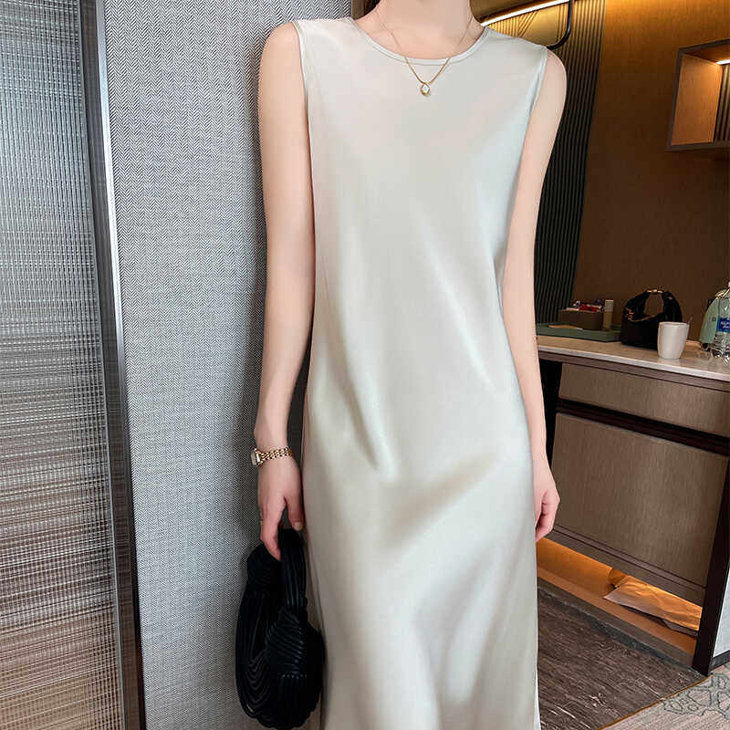 高级感圆领真丝吊带连衣裙女春夏醋酸缎面中长裙内搭丝绸无袖气质