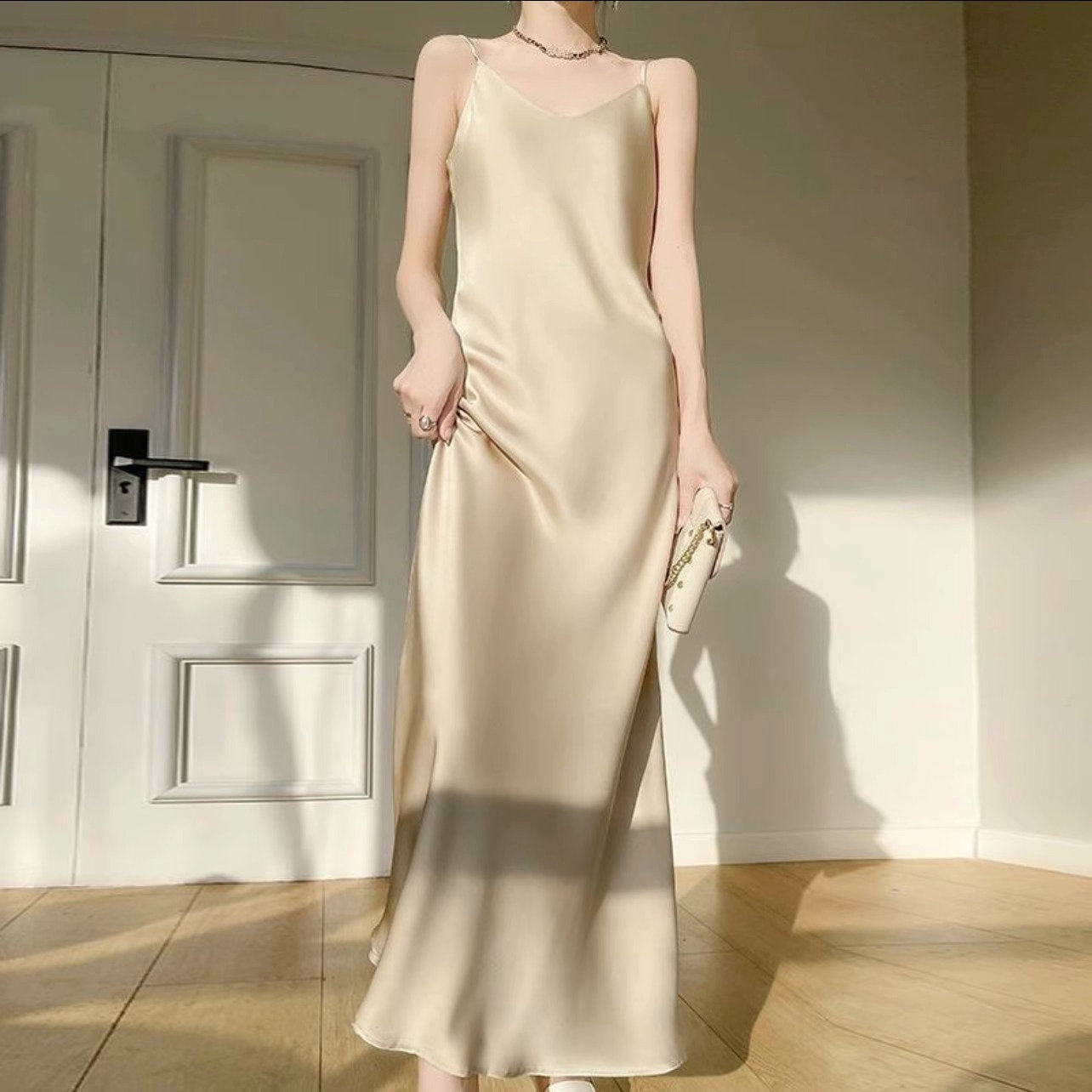 小重磅21姆米真丝法式V领斜裁桑蚕丝缎面吊带连衣裙收腰长裙子女