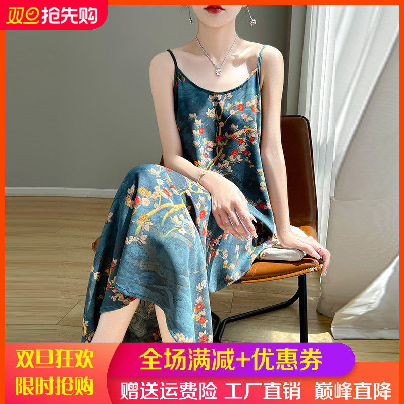 真丝吊带连衣裙女夏季宽松内搭印花长裙100%桑蚕丝缎面吊带背心裙