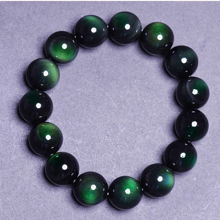 天然黑曜石手链男士女款彩虹猫眼手串全绿眼紫眼猫眼石黑耀石水晶