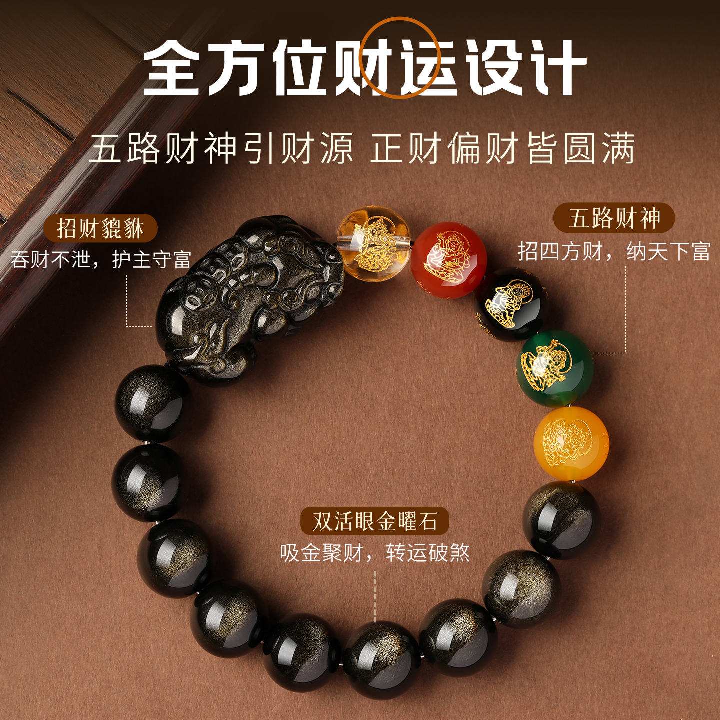 天然黑曜石手链金曜石貔貅手串本命年男士五路财神手链转运珠礼物