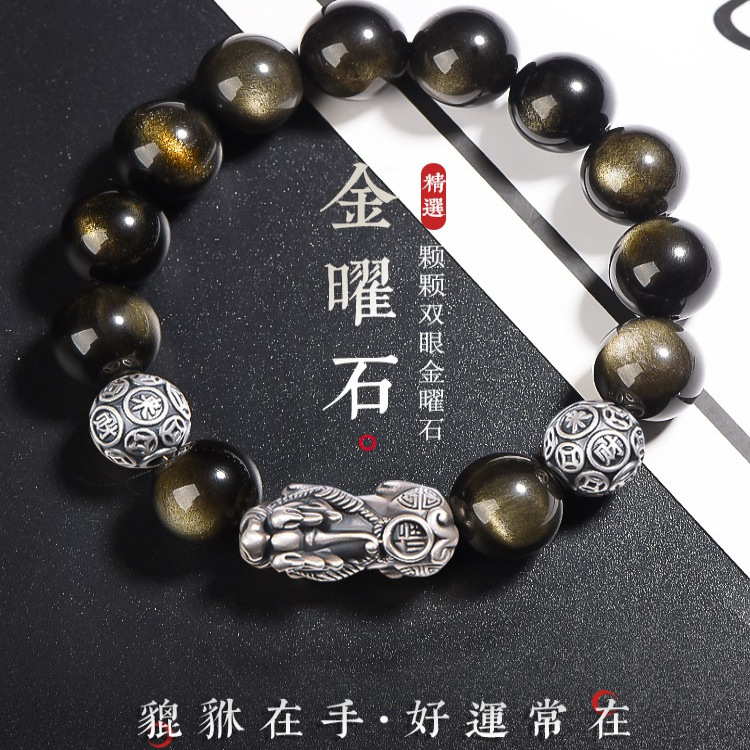 天然黑曜石手链男潮金曜石佛珠手串女水晶国潮手饰品原创设计个性