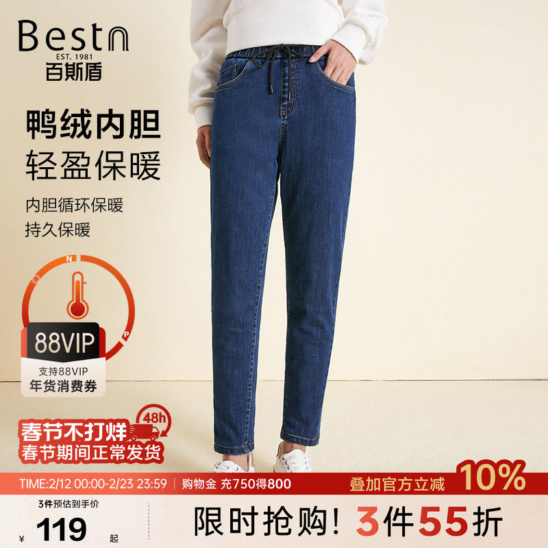 【羽绒裤】百斯盾官方女装牛仔裤冬季新款加绒加厚保暖修身铅笔裤