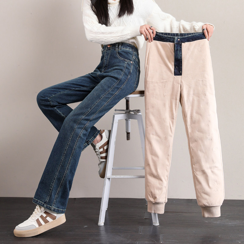 3D打印 女士微喇牛仔裤 一体绒高含羽绒保暖牛仔长裤 休闲裤 冬款