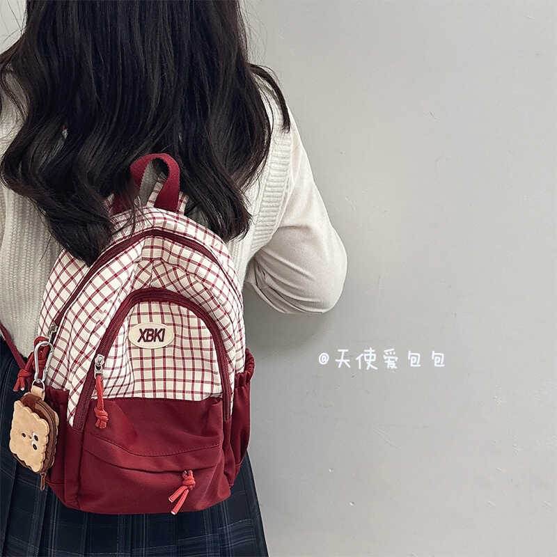日系ins格子书包女复古小清新双肩包女高中大学生百搭轻便背包
