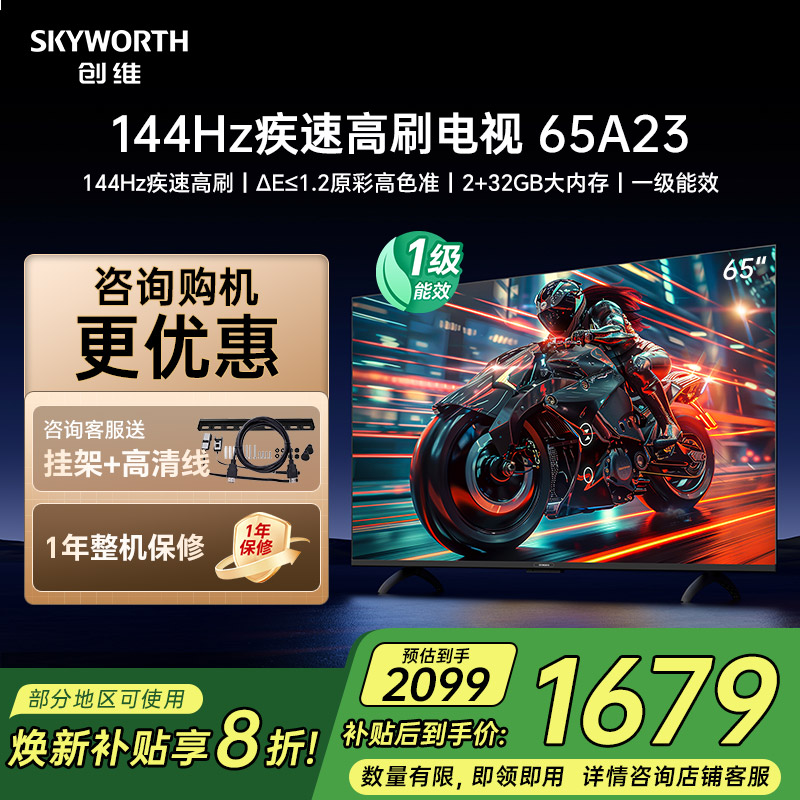 创维电视65A3F 65英寸144Hz高刷大内存电视机 以旧换新补贴20%