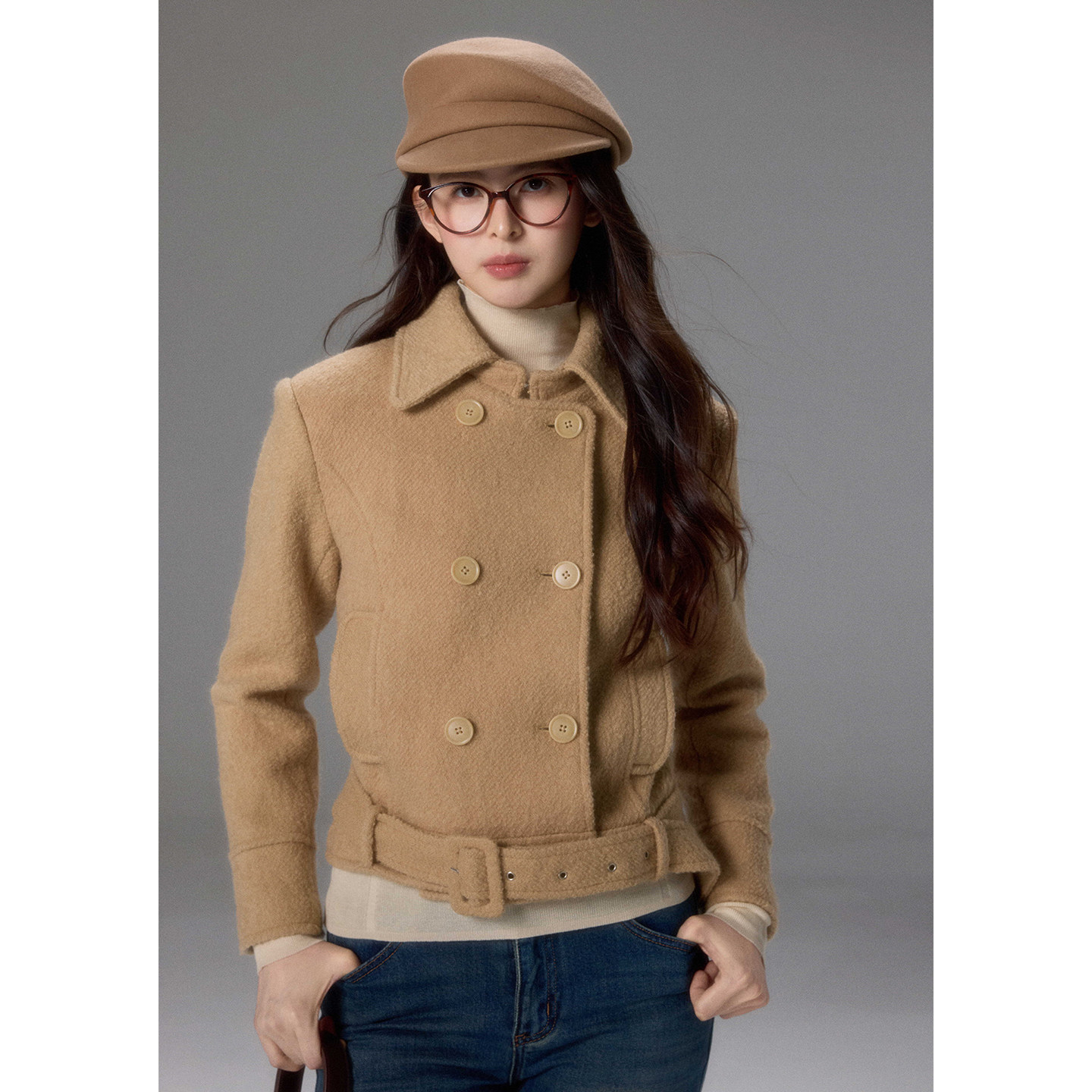PEMPL·卡其色正肩双排扣戗驳领毛呢外套女短款系带保暖加厚上衣