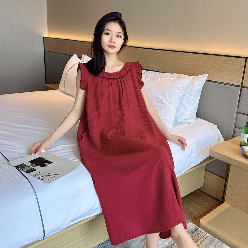 胖妹妹大码性感睡裙夏季纯棉红色吊带家居裙200斤孕妇棉纱睡衣裙
