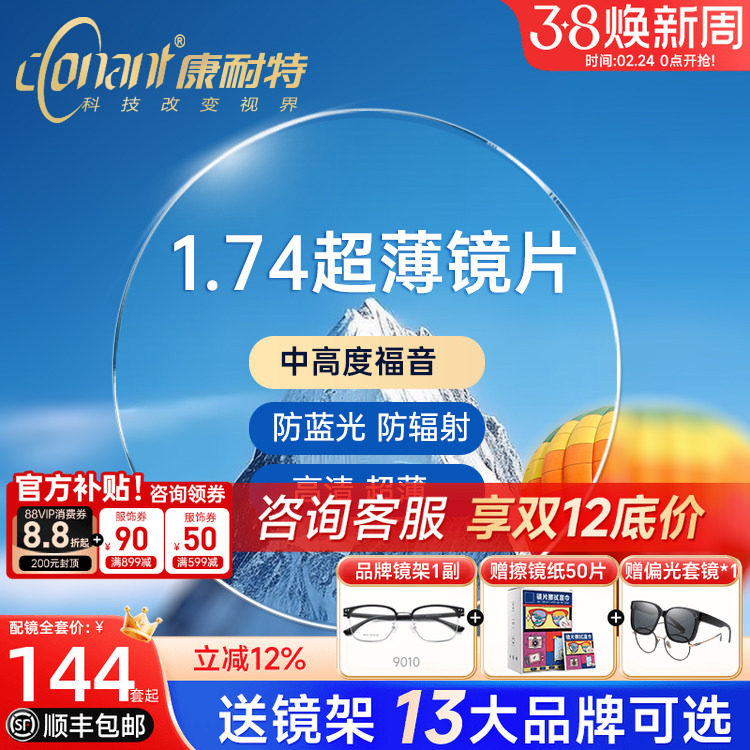 正品康耐特近视镜片1.74非球面FIX双曲面双非镜片防蓝光高度超薄
