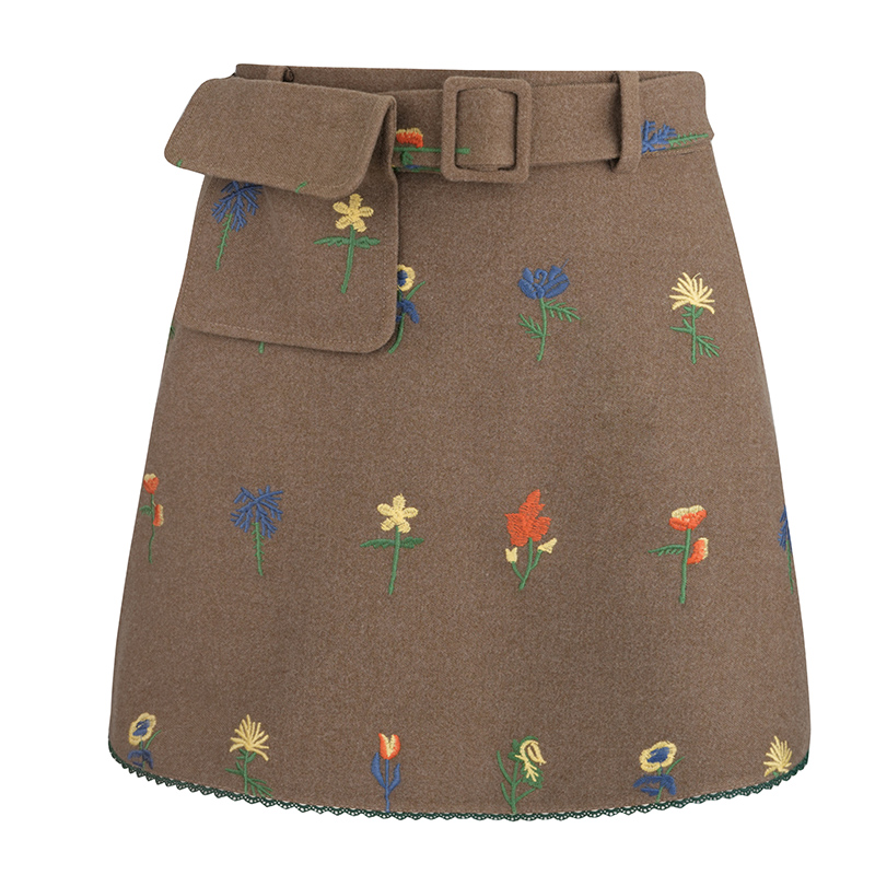 JUNGLE ME驼色秋冬复古高腰绣花短裙减龄小A型松紧腰带包半身裙