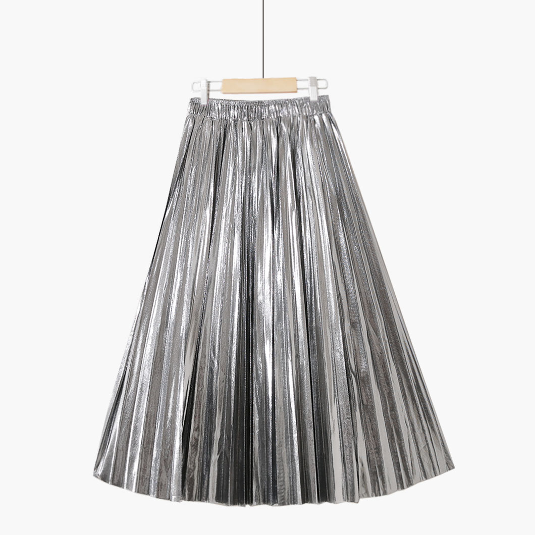 秋冬款烫金闪亮片褶皱a型高腰通勤纯色百褶时尚显瘦中长款半身裙
