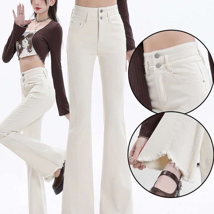 白色喇叭裤小个子九分牛仔裤秋装2025爆款高腰遮肚子流苏微喇裤子