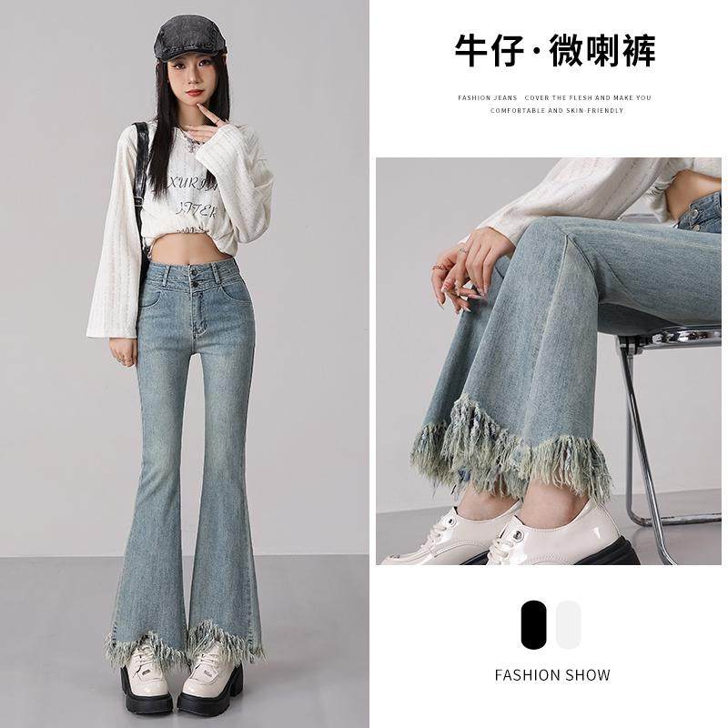 流苏牛仔裤女时尚新款微喇叭阔腿高腰休闲百搭弹力大码韩版九分裤