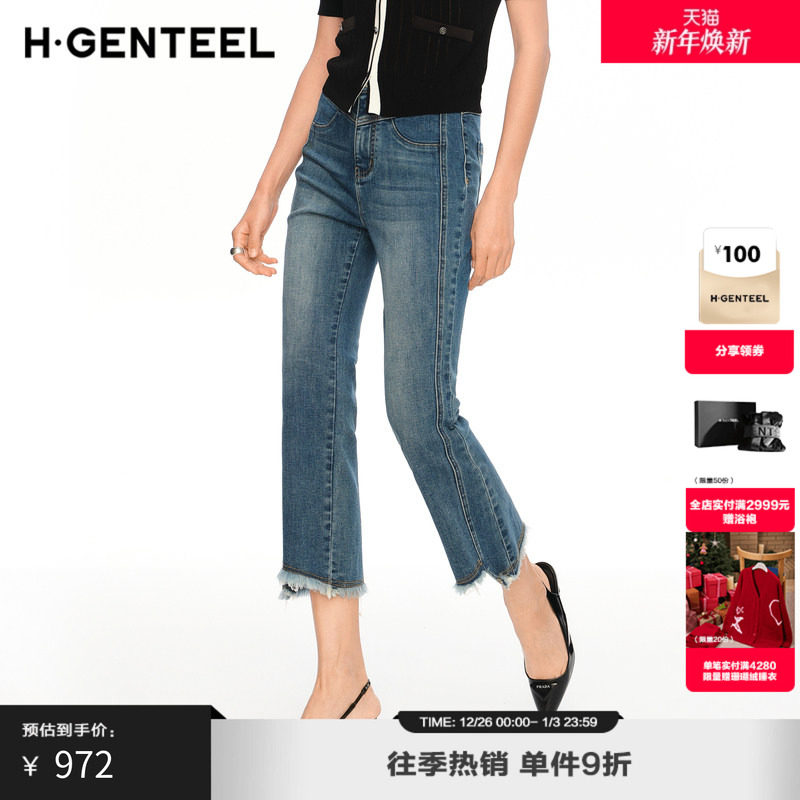 H·GENTEEL荷高新款夏装女喇叭流苏脚口不规则拼接九分牛仔裤