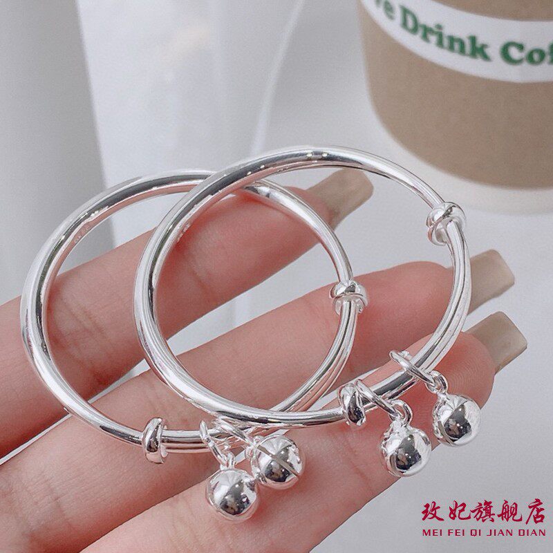 香港正生光面铃铛纯银手镯足银9999男女宝宝小孩子中大童学生银镯