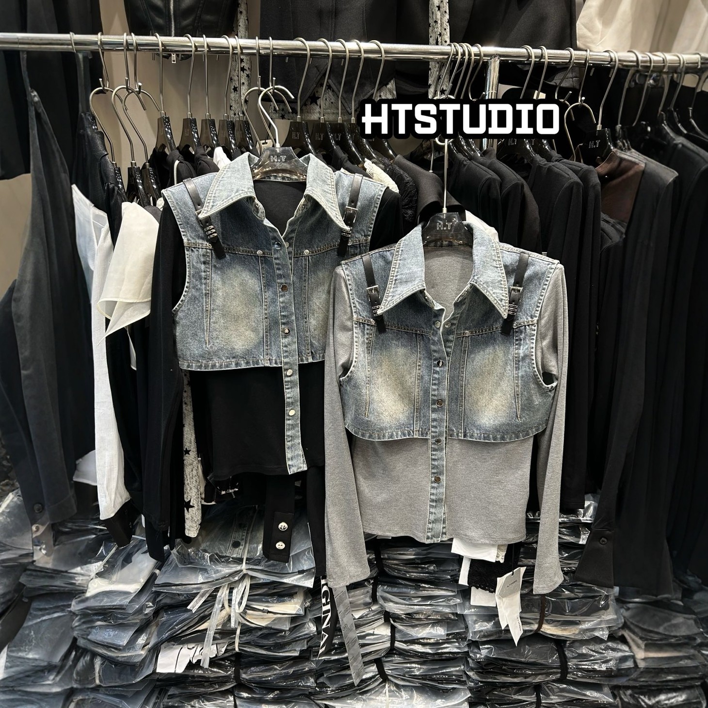拼接牛仔长袖衬衫女欧货2026早春新款甜酷辣小众修身显瘦洋气上衣