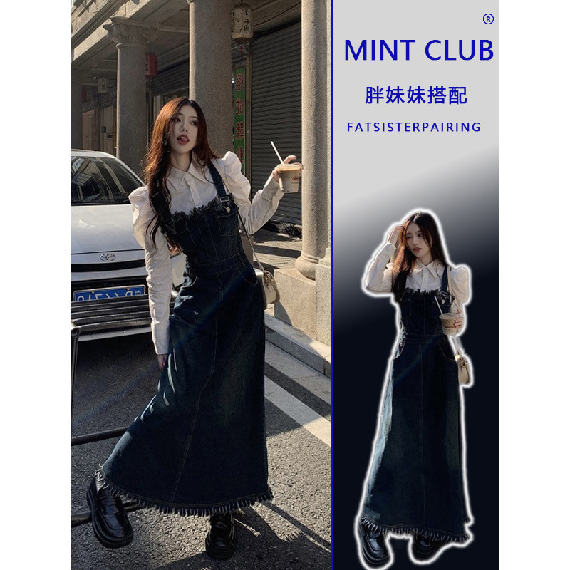 大码春季修身毛须边牛仔背带裙女胖mm轻奢风内搭长袖衬衫两件套装