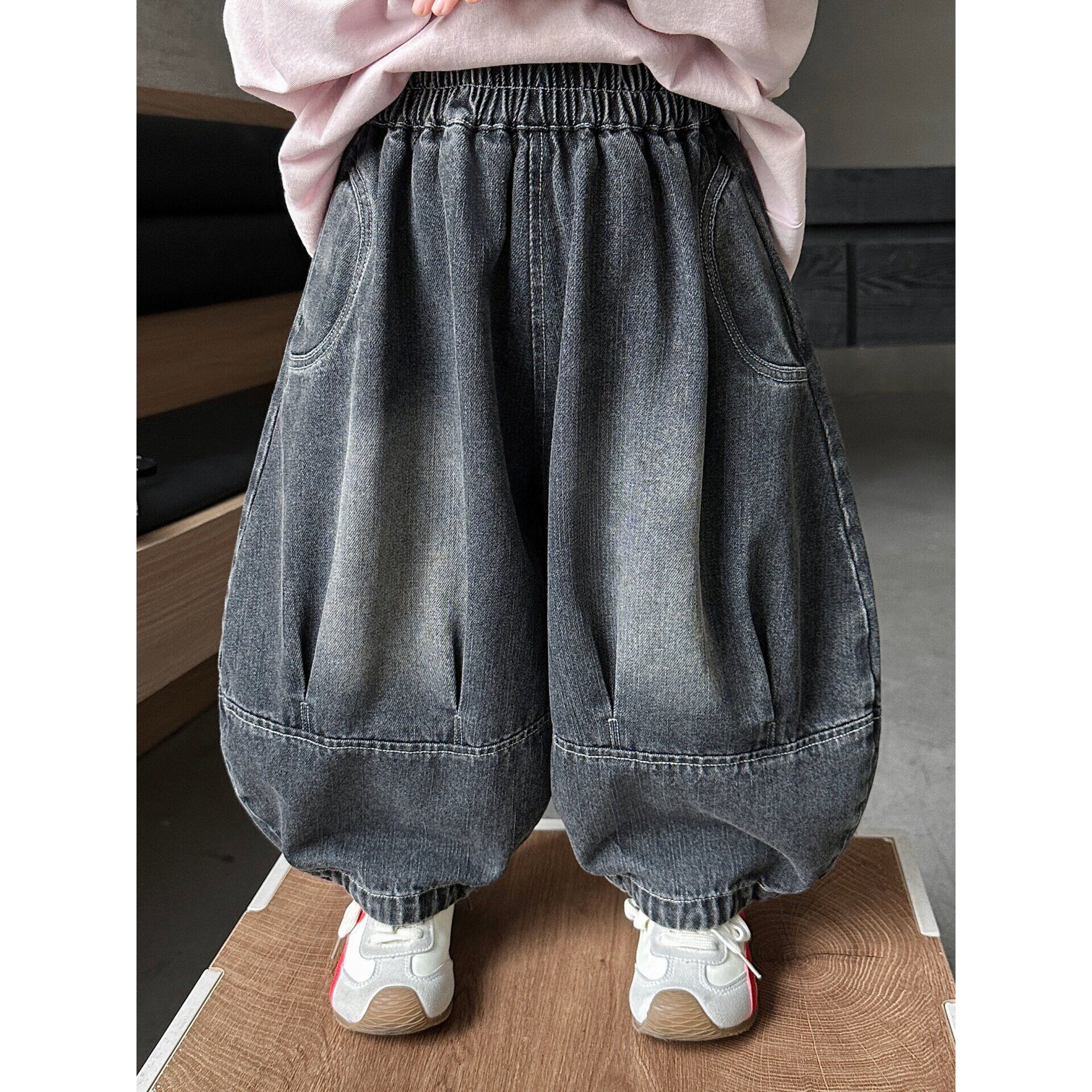 男女童春秋款牛仔裤韩版宽松亲子款哈伦裤儿童防褪色拼接阔腿裤潮