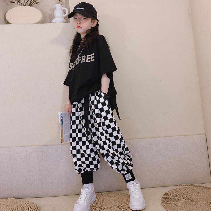 儿童街舞短袖套装两件套男女童棋盘格舞蹈服韩版哈伦裤薄款大童潮