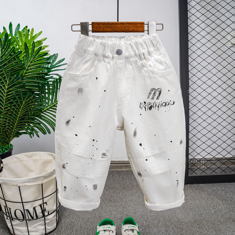 韩版儿童春秋季裤子泼墨涂鸦白色休闲长裤男女童宽松哈伦裤洋气潮